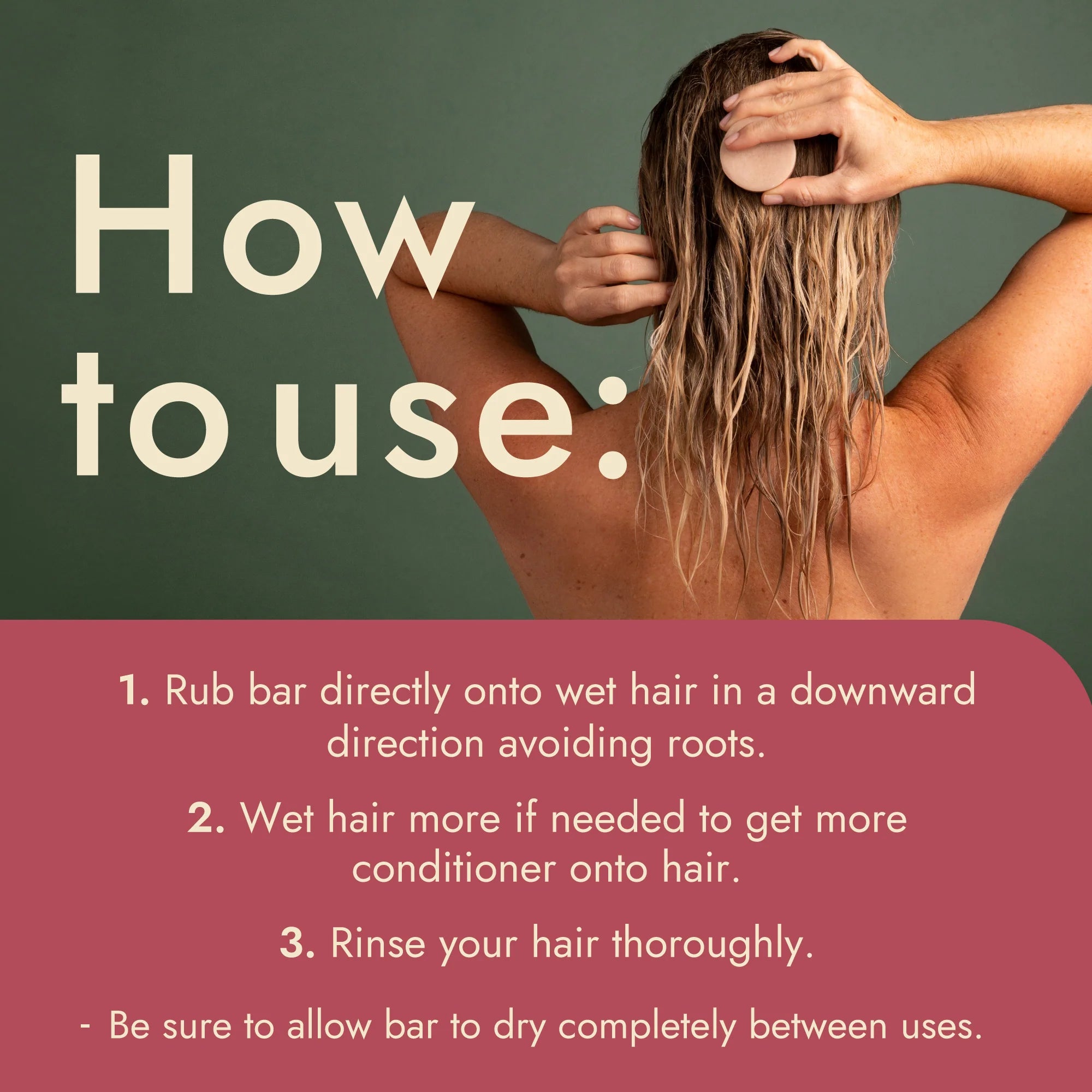 Just rub the conditioner bar directly onto your wet hair, and gently massage. Rinse your hair thoroughly, and be sure to allow your bar to dry completely between uses. That's it!
