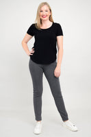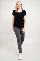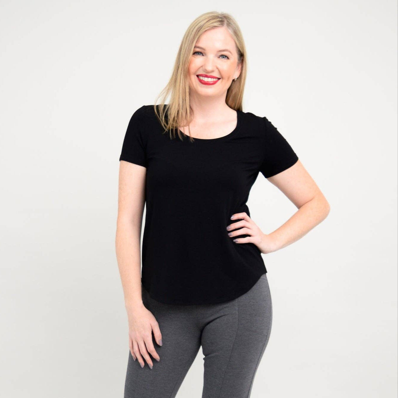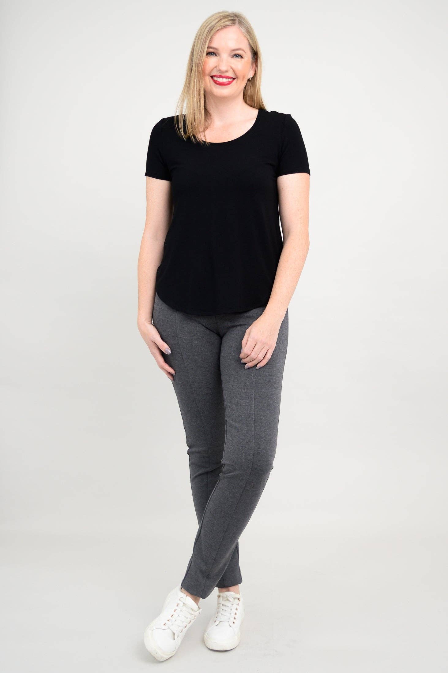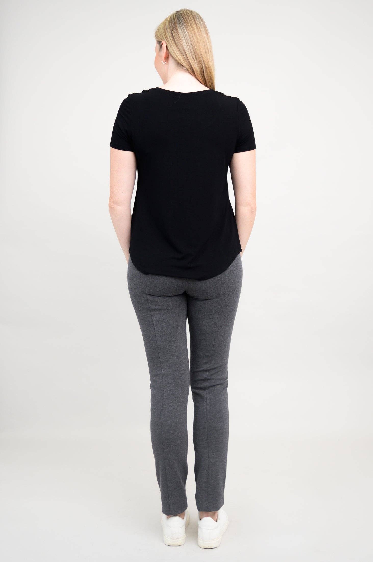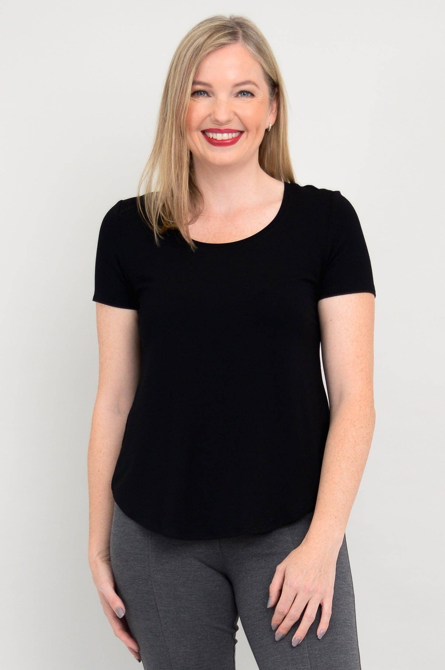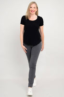 The Tessa offers easy wear with a touch of shaping, for a basic that flatters all. Fabric drapes gently, without pulling or catching around the hips and bottom. A shirt-tail hemline provides fluidity, ensuring a soft visual line. The Tessa Tee compliments trousers, capris and skirts of all cuts.