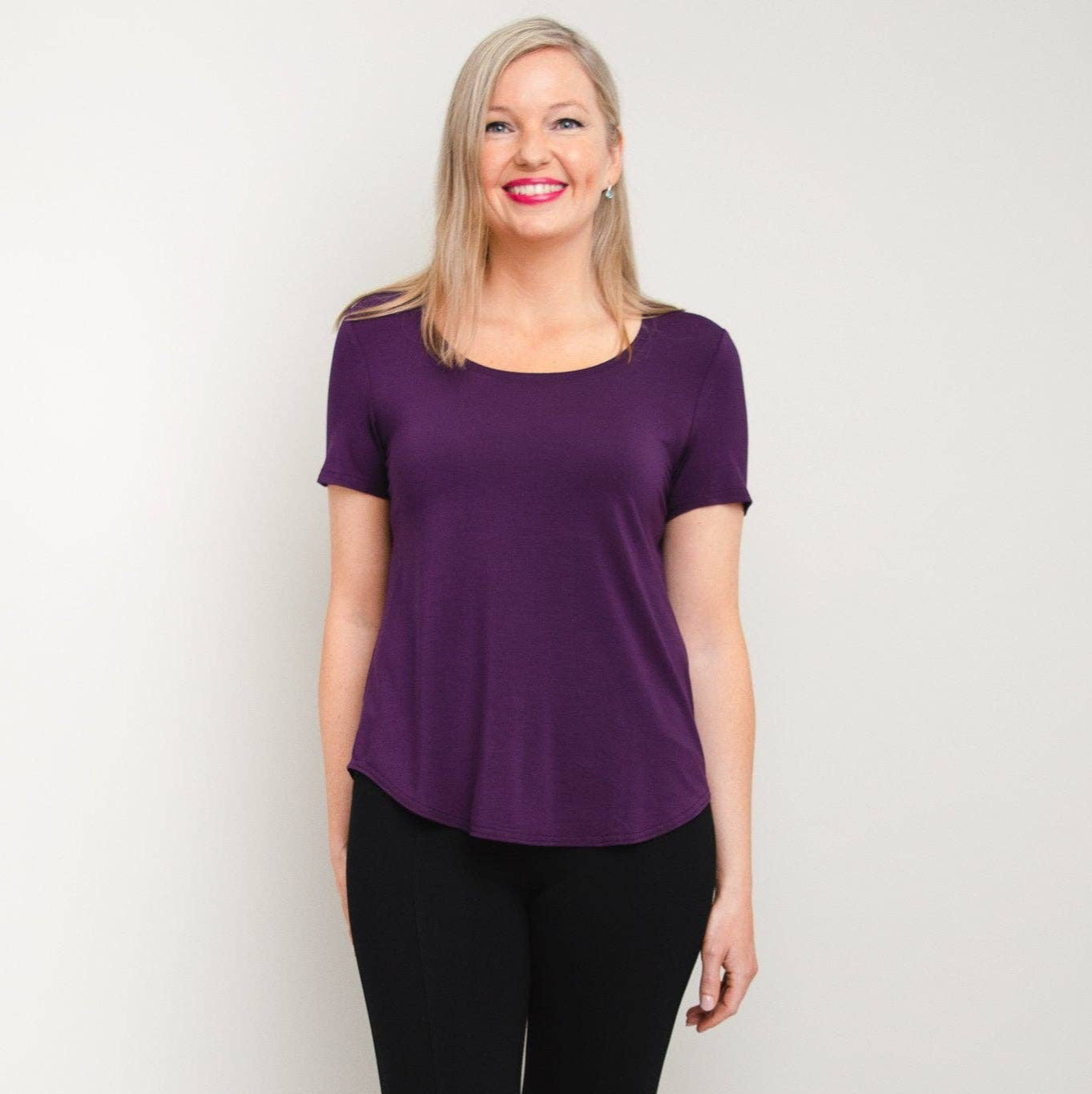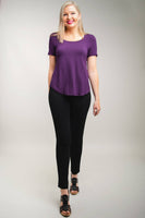 The Tessa offers easy wear with a touch of shaping, for a basic that flatters all. Fabric drapes gently, without pulling or catching around the hips and bottom. A shirt-tail hemline provides fluidity, ensuring a soft visual line. The Tessa Tee compliments trousers, capris and skirts of all cuts.