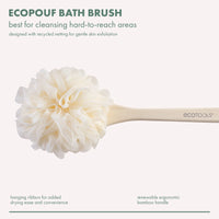 • The EcoTools EcoPouf® Bath Brush is designed with recycled netting and an ergonomic handle for better control while cleansing