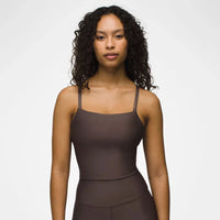 Our lustrous prAna Sculpt™ fabric adds chic style and sun protection to your sweat sessions with this square neck cami. Moisture-wicking and made to move with performance-driven recycled polyester, the prAna Sculpt™ Adjustable Cami offers light support with an interior shelf bra and removable cups. Finished with adjustable V-shaped back straps so you can find your perfect fit. Every body is different, but we recommend this style for A-B cups.
