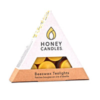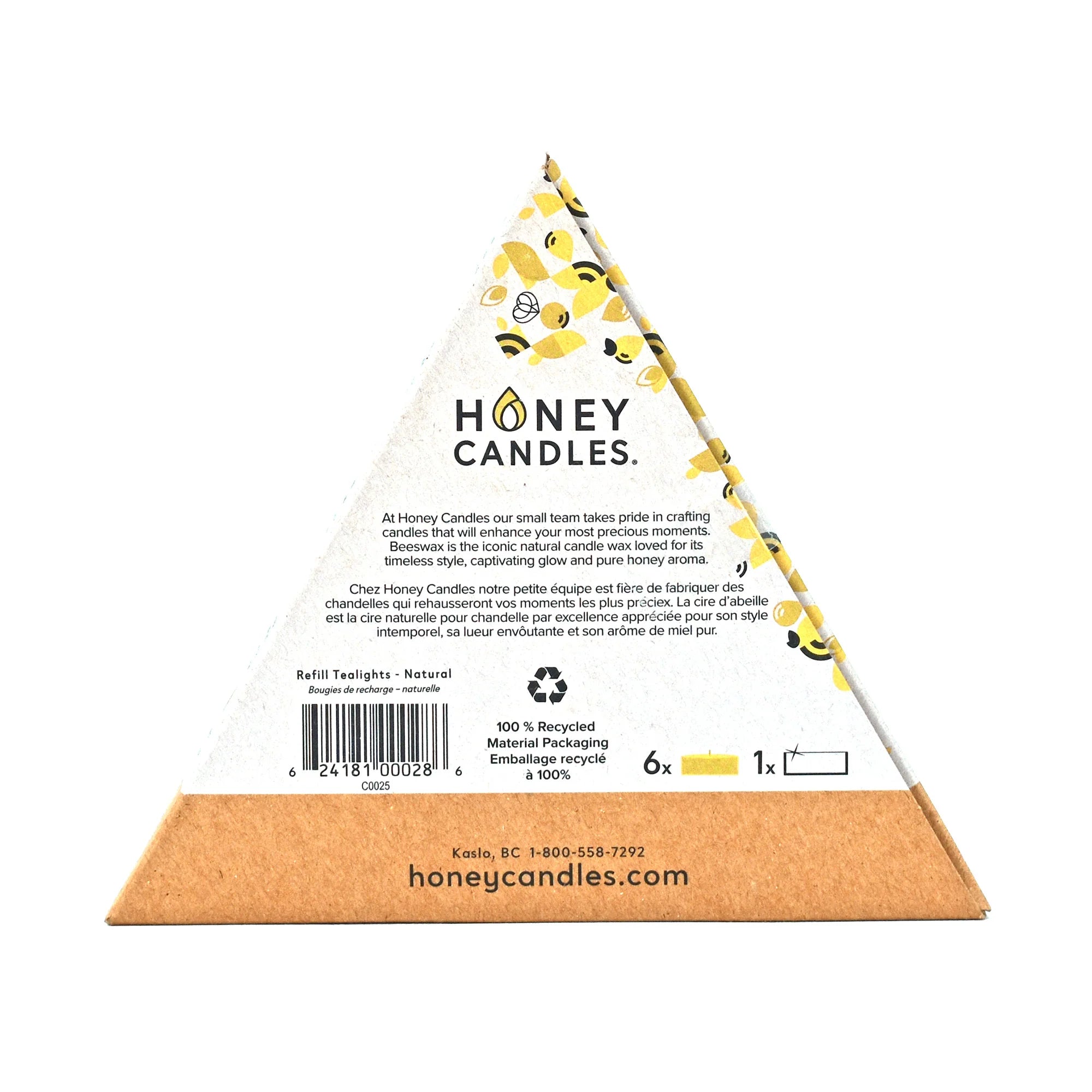 A beautiful triangle pack with 6 Honey Candles® 100% pure beeswax tealights, along with one durable and reusable glass cup. Makes for a fantastic gift!