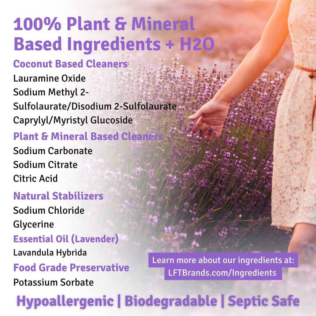 Purified Water; Lauramine Oxide, Sodium Methyl 2-Sulfolaurate (and) Disodium 2-Sulfolaurate, Caprylyl/Myristyl Glucoside (Plant based cleaning agents); Glycerine (Foam stabilizer); Lavandula Hybrida (100% pure essential oil); Sodium Carbonate (Water conditioner); Potassium Sorbate (Food grade preservative); Sodium Citrate, Citric Acid (Natural pH modifiers); Sodium Chloride (Thickener).
